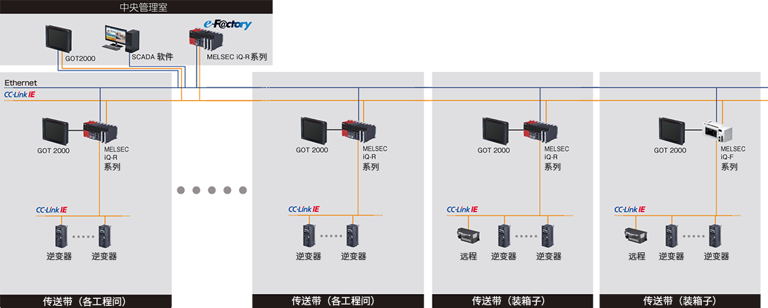 传送带输送在连接加工、灌装、检查、包装、出货等各道工序的生产线构筑上不可或缺。每道工序输送的对象不尽相同,因此需要具有较强稳定性的马达控制来应对负荷变动。三菱电机通过丰富的驱动产品阵容,不仅实现了稳定的输送,还能满足您的节能、节省空间等方面的各种要求。