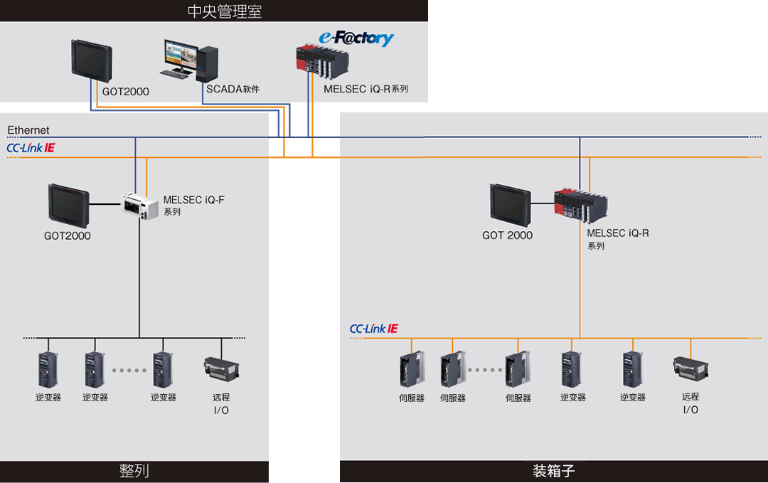 这是将工件装入箱内的工序。由于需要先把产品排列整齐后再拾取装箱,因此高精度的同步控制不可或缺。三菱电机的FA产品不仅可以通过高速、高精度的同步控制提高生产效率,还通过满足装置的安全需要和预防保全为缩短生产线的停机时间做出贡献。
