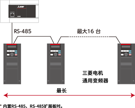 序列发生器MELSEC iQ-F系列内置RS-485通信端口,并支持三菱电机变频器协议。通过使用专用程序等的支援功能,可以轻松地进行变频器的运转、频率设定,缩短编程时间。