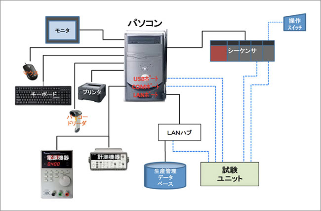 为了实现出货试殓自动化,在名古屋制作所和协作工厂中使用了本公司自行开发的试验装置,试验装置由基于Windows的计算机和利用Visual Basic开发的应用组成,虽然其基本配置已经超过20年没有改变,但随着产品数量的增加等试验装置。