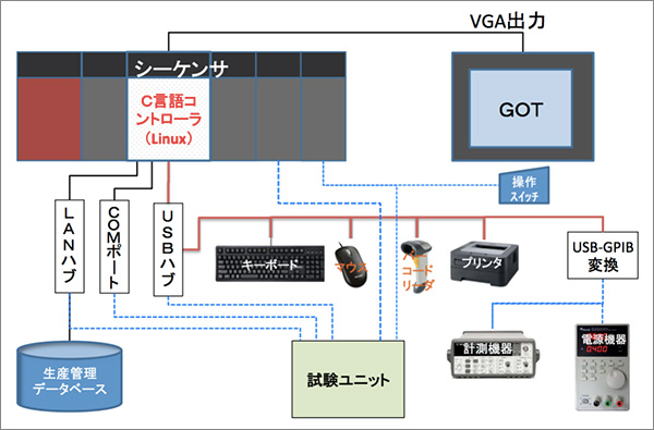 C语言控制器是安装到可编程控制器的基本单元上后,可以用C语言控制可编程控制器的CPU单元。名古屋制作所从2010年开始将试验装置内的计算机按顺序依次转移成C语言控制器。在原来的系统中,除了可编程控制器外,计算机上还连接了操作计算机的键盘、显示器、打印机和LAN。LAN前端有生产管理数据库,用于存储可编程控制器的试验结果信息。