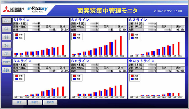 表面封装工序在长年改善活动的效果作用下,从以前开始就实现了很高的运转率。要在原本就比较高的值基础上进一步提高并接近100%是一件极为困难的事情,但我们通过可以实时运用现场数据、将变化可视化的e-F@ctory技术,正在不断强化以实现100%运转率为目标的应对措施。
