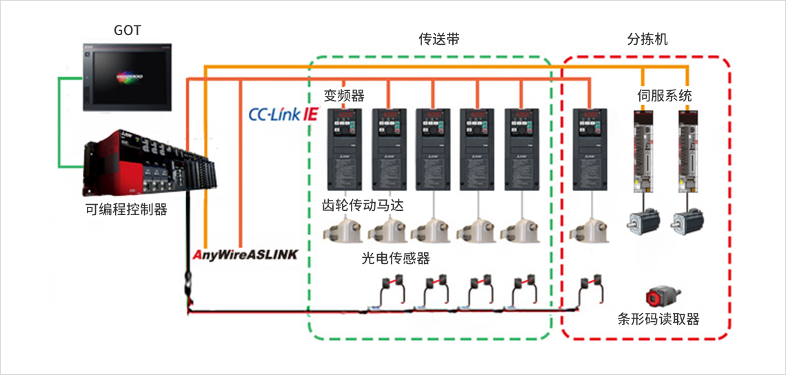 1.通过在可进行高速大容量通信的CC-Link IE中接入最新的可编程控制器、变频器、伺服机构,实现高速输送、高速分拣。