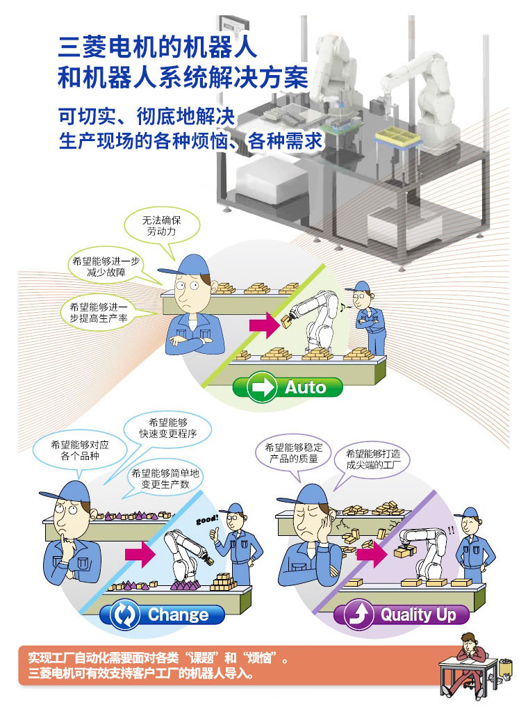 利用高级别的高速动作、高刚性臂提供能够实现高精度动作和高级组装作业的智能化解决方案,促进工厂的优化升级,从而实现胜人一筹的产品制造。