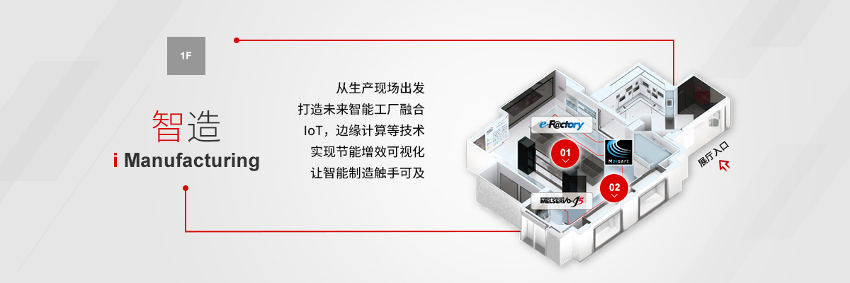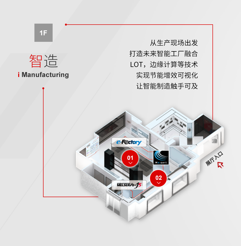 三菱电机自动化中心1F-3F,占地约1500平方米分为“智造、智创、智学、智用”四个展区